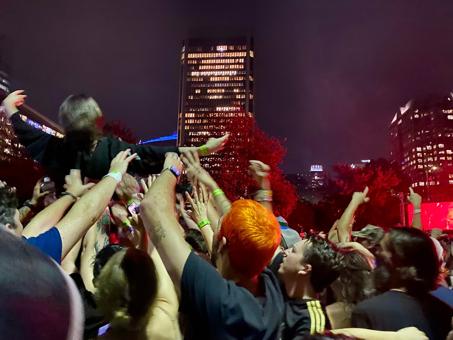 I was at the kick-ass Turnstile concert on Brown’s Island last week, along with thousands of other people. I really couldn’t see very well, but it didn’t matter, the energy of the concert was hella fun and overwhelmingly positive (aside from the shitty pepper-spray incident). One thought: I didn’t love the tiered ticketing at a hardcore/punk show (the whole front section was cordoned off for folks who paid more for their tix). Like, it just didn’t fit the equal-opportunity vibe of punk shows. But I did love the way everyone made the most of where they were standing. There was a mosh-pit behind the barrier near us. Some guy climbed up into a tree for a better view and, even better, a few folks even ascended a brick column with their rope-climbing gear to watch the show. Good times.