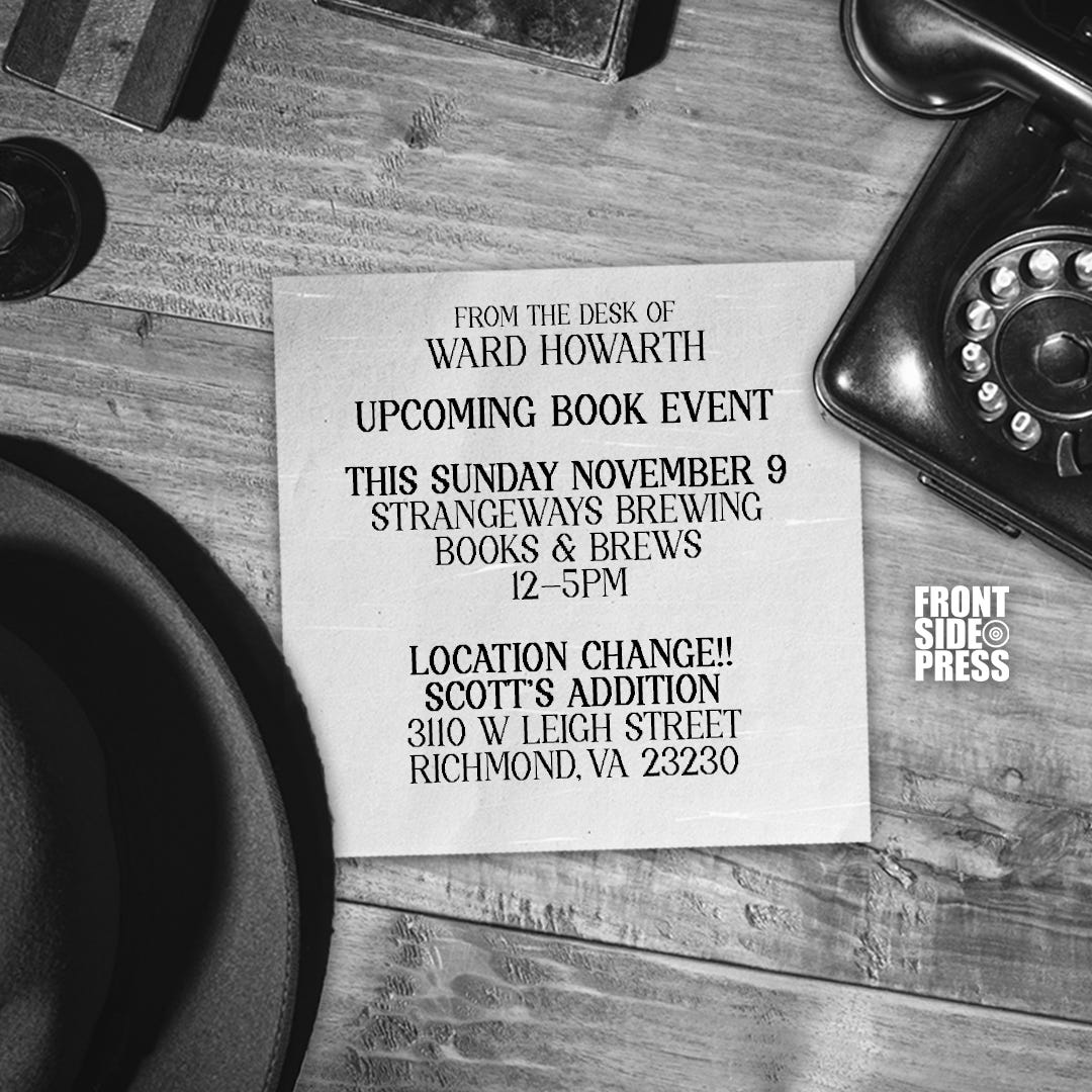 Hello all — this is just a quick update for anyone considering stopping by Strangeways Brewing’s Books & Brews event this Sunday, it’s now at their SCOTT’S ADDITION location (3110 W Leigh Street, Richmond, VA, 23230). It’s from 12P-5P and I’m really looking forward to it. I believe there’ll be a host of other authors and booksellers there, so there should be something all tastes & interests! I’m looking forward to networking & meeting new readers!